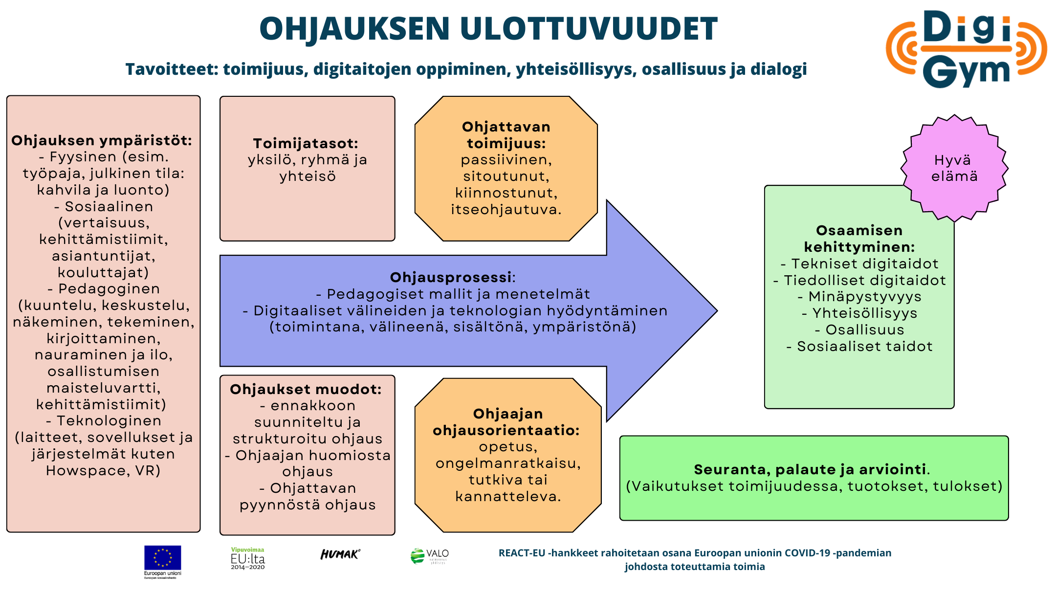 Ohjauksella voidaan tukea osallistujia pohtimaan, ottamaan kantaa sekä tuottamaan uusia näkökulmia ja ratkaisuja. Hankkeen toiminnassa ohjataan paljon ja ohjaaminen voi olla tiedostettua tai tiedostamatonta. Aina ohjaajan kohdatessa osallistujan, hän vaikuttaa osallistujan käsitykseen itsestään oppijana ja ihmisenä. Siksi on tärkeä pohtia ja tiedostaa, miten ohjaajana toimii erilaisissa ohjaustilanteissa. Alta löytyy kaaviokuva DigiGym-hankkeessa havaituista ohjauksen ulottuvuuksista eriteltyinä.