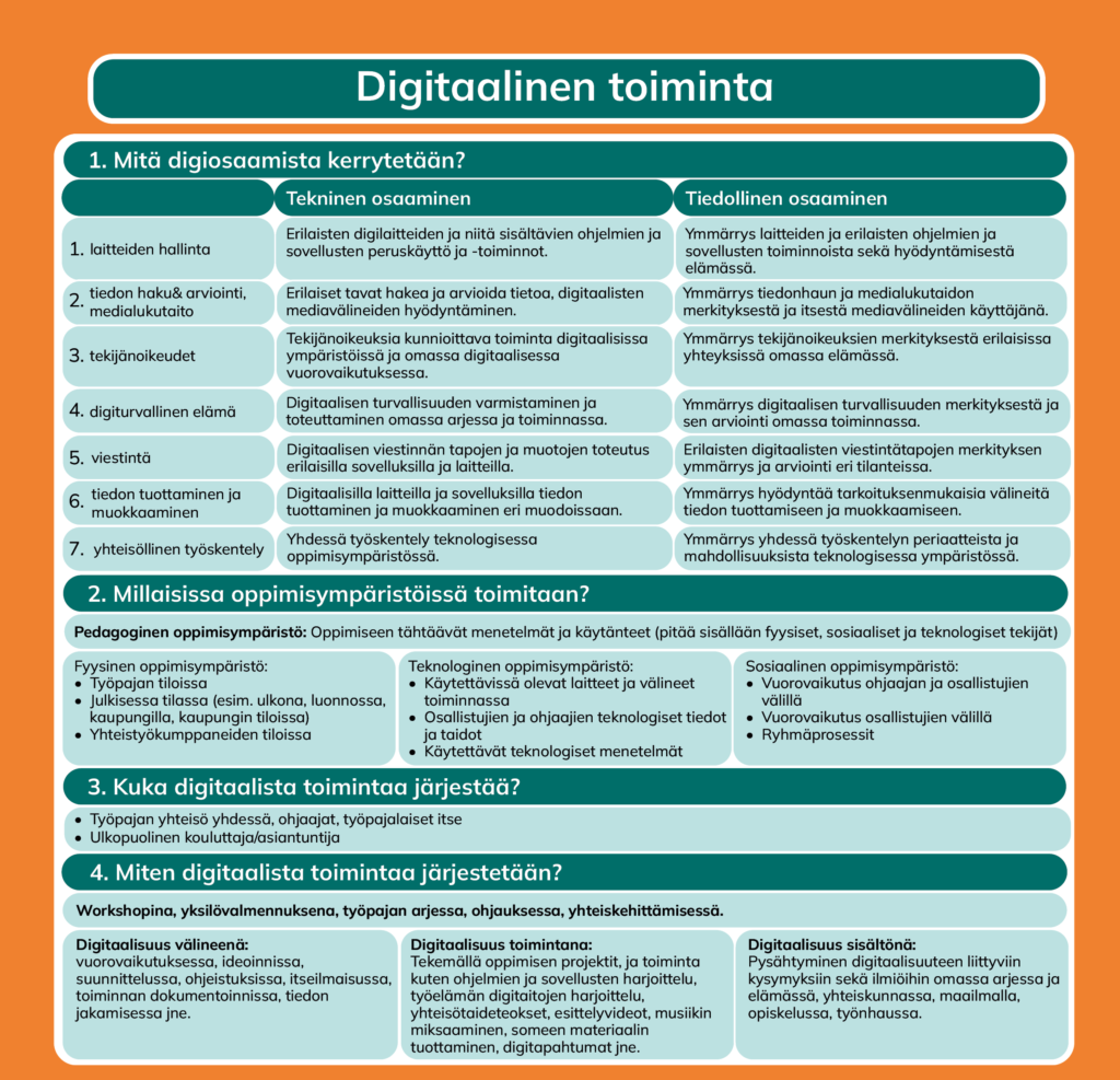 laitteiden hallinta; tiedonhaku, arviointi ja medialukutaito; tekijänoikeudet; digiturvallinen elämä; viestintä; tiedon tuottaminen ja muokkaaminen; yhteisöllinen työskentely.