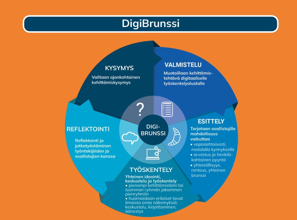 Yhteiskehittäminen tapahtuu kolmella tasolla: jalkautumalla ja kohtaamalla arjessa, ohjaamalla ja treenaamalla digitaitoja (workshopeissa ja yksilövalmennuksessa) sekä kehittymällä ja onnistumalla yhdessä (DigiBrunssit). DigiBrunsseilla kohdataan kuukausittain.